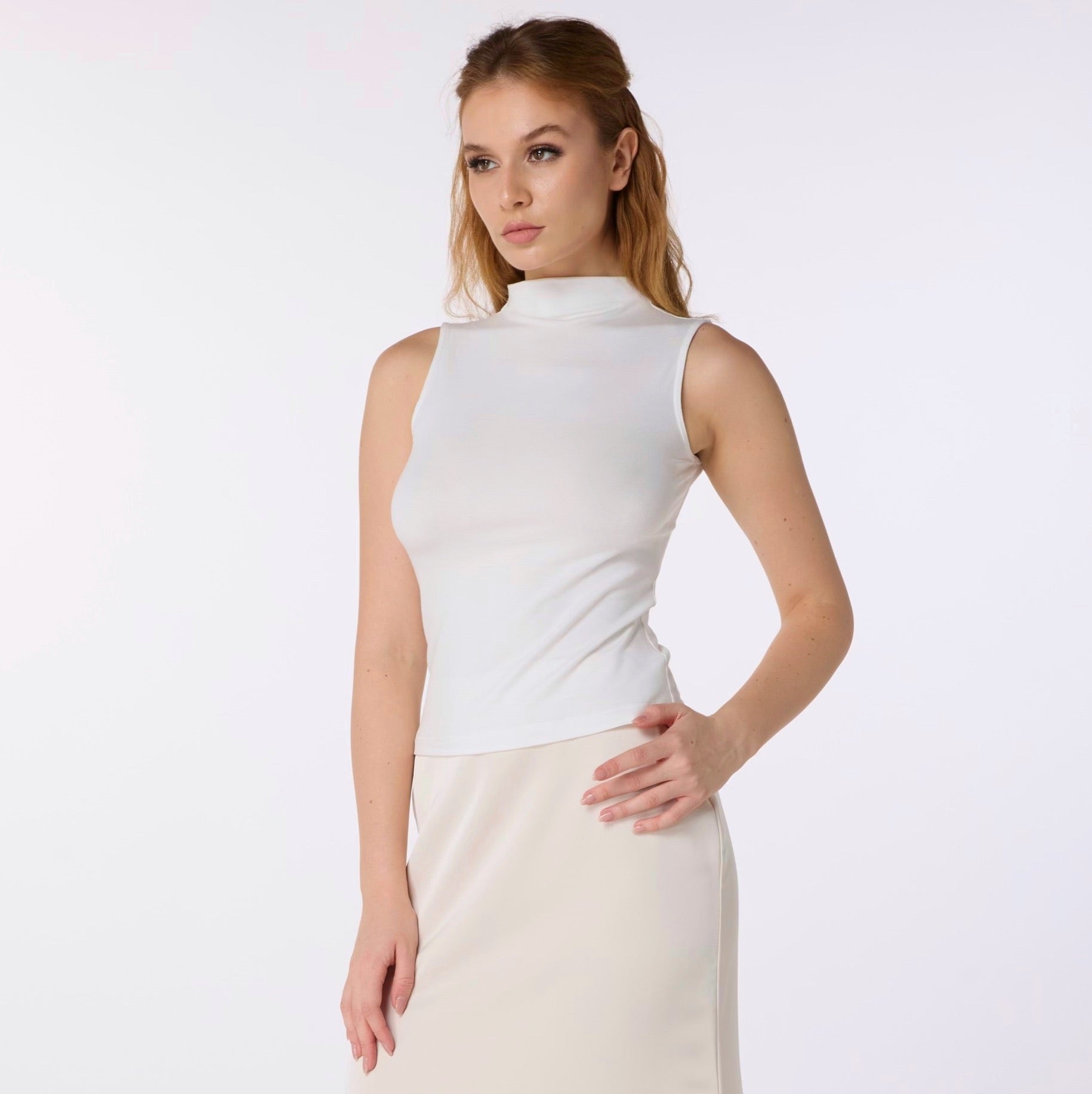 The Soft Turtleneck Top is a sleeveless, body-hugging piece crafted from smooth viscose jersey with added stretch. It features a soft, shallow neckline and a flattering silhouette that gently contours the body without restricting movement.